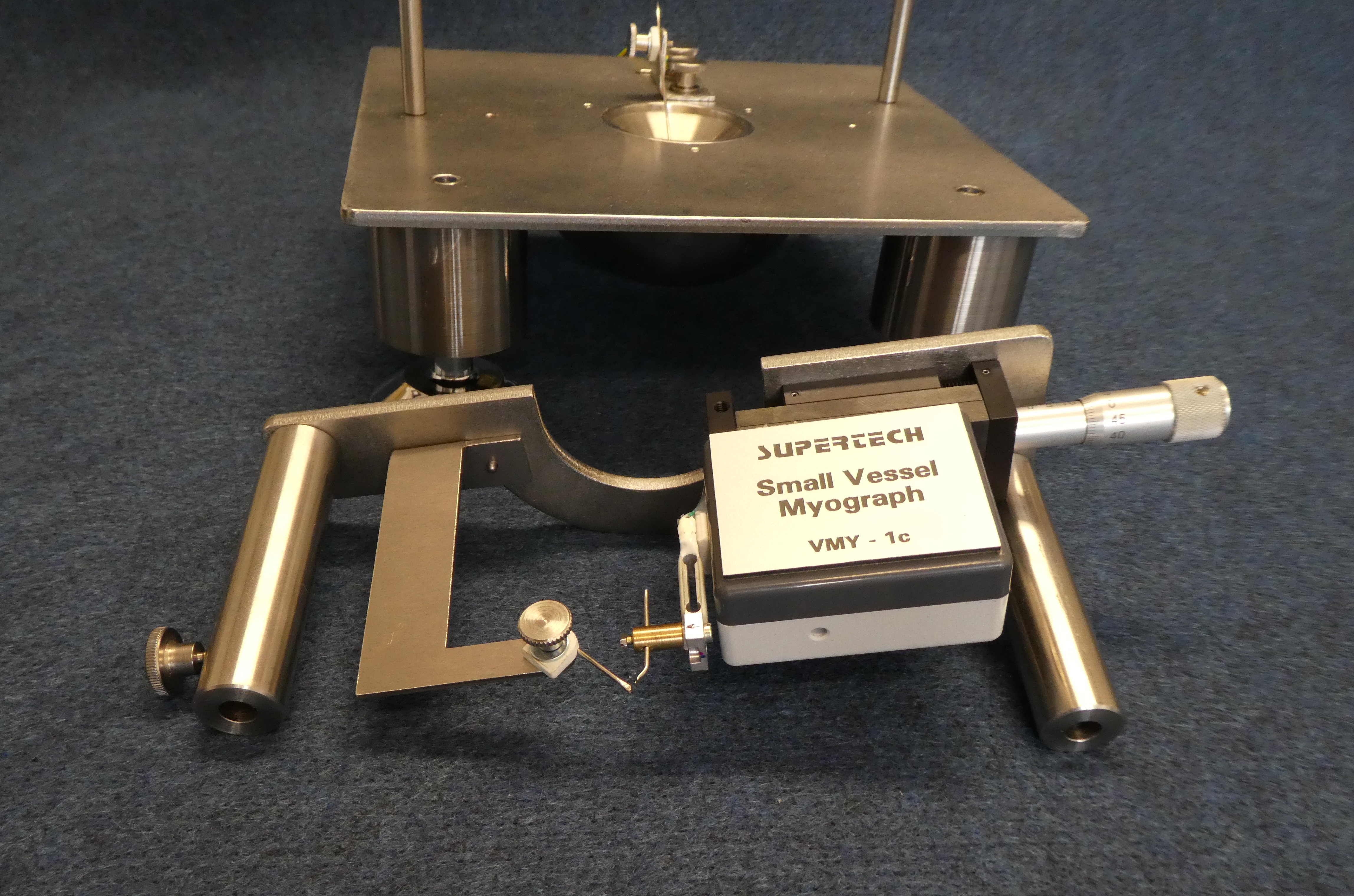 Small pieces of vessels can be fixed as rings on two tungsten wires. The internal diameter range of the measurable vessels is 1 to 10 mm. One of the fixing wires is attached to the force sensor. The force sensor is part of the Force Sensor Headstage VMY-1c. The other, opposite holding wire is fixed on the removable upper part on easily adjustable way. The Force Sensor Headstage VMY-1c is fine positioned by a micrometer, providing accurate control of vessel circumference.